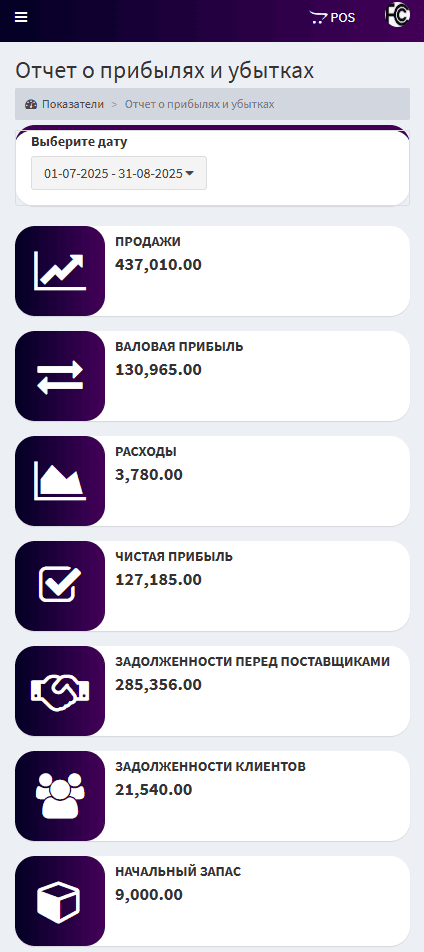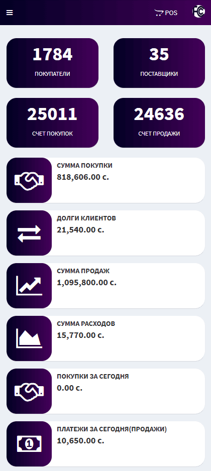 В окне показатели вы можете увидеть всю статистику, кол-во покупателей и поставщиков, покупки и долги клиентов, продаж, платежи, расходы и другие данные!